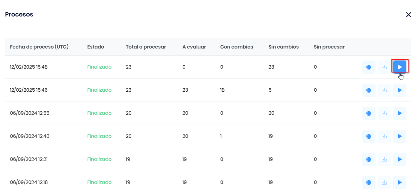 En la pantalla de Procesos desde la cual accedemos al informe de resultados podremos disponer además de un rápido análisis de los resultados obtenidos del proceso ejecutado. La tabla que podremos visualizar contará con diferentes columnas que en su conjunto nos ayudarán a determinar un rápido análisis de la ejecución.