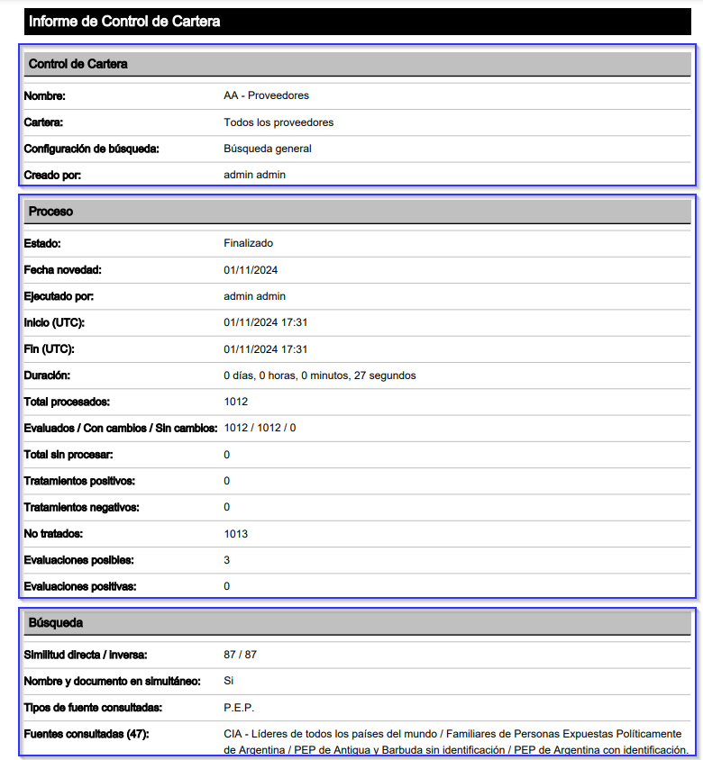 Junto a la ejecución de un control de cartera tendremos a nuestro alcance la posibilidad de generar informes de resultados que nos permitirán tener más información del control realizado (no de los resultados), tiempos de ejecución, cantidad de personas evaluadas, fuentes consultadas, etc.